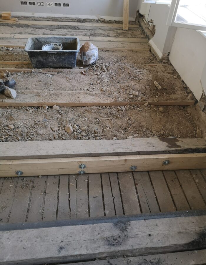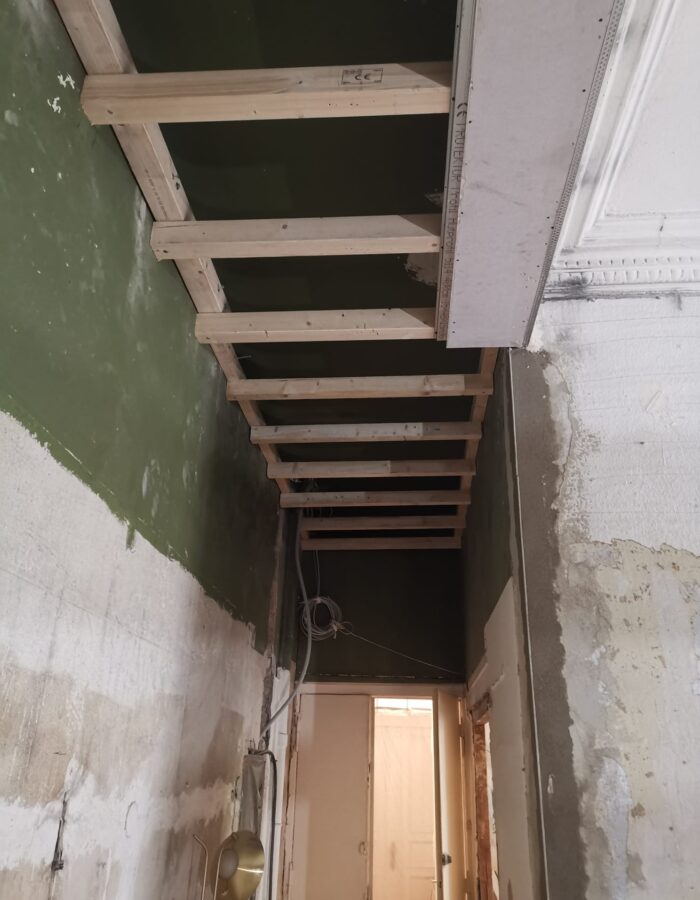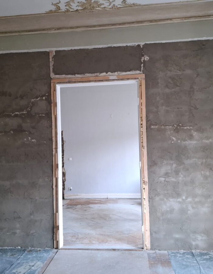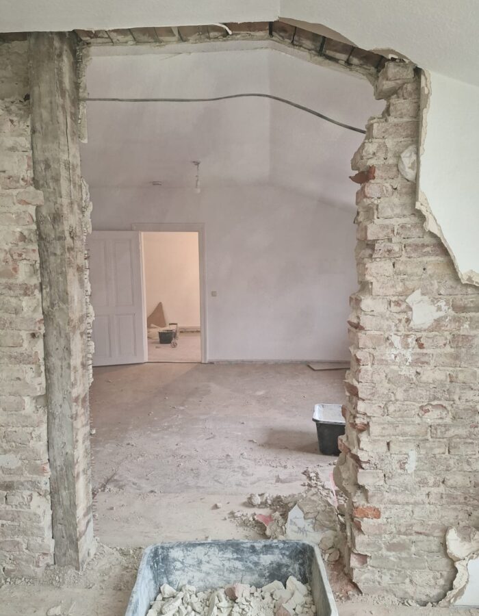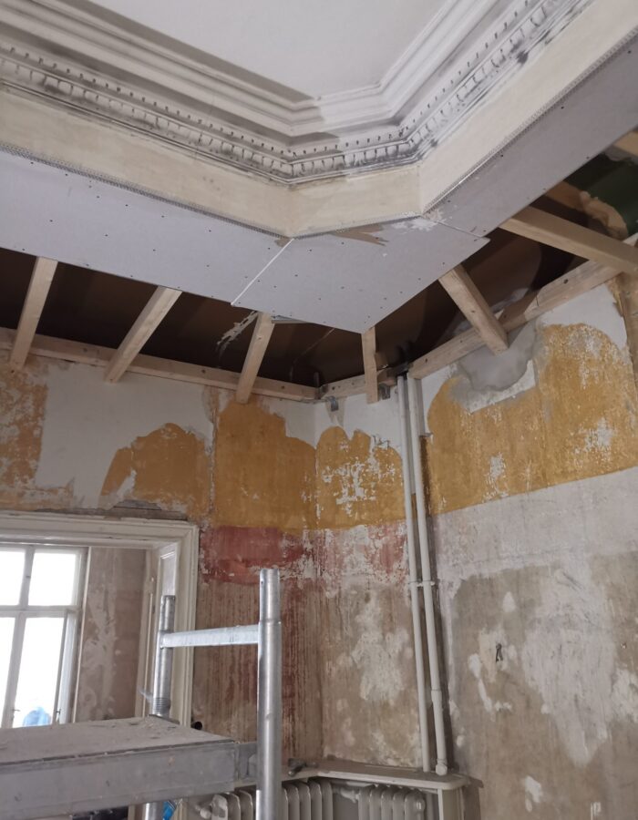 Abriss bestehender Innenwände und Errichtung einer Holzbalkenunterkonstruktion zur Erhaltung von Stuckleisten