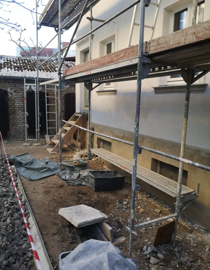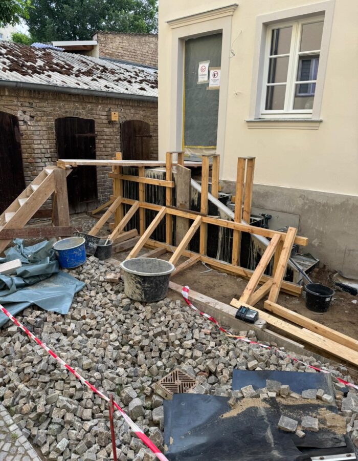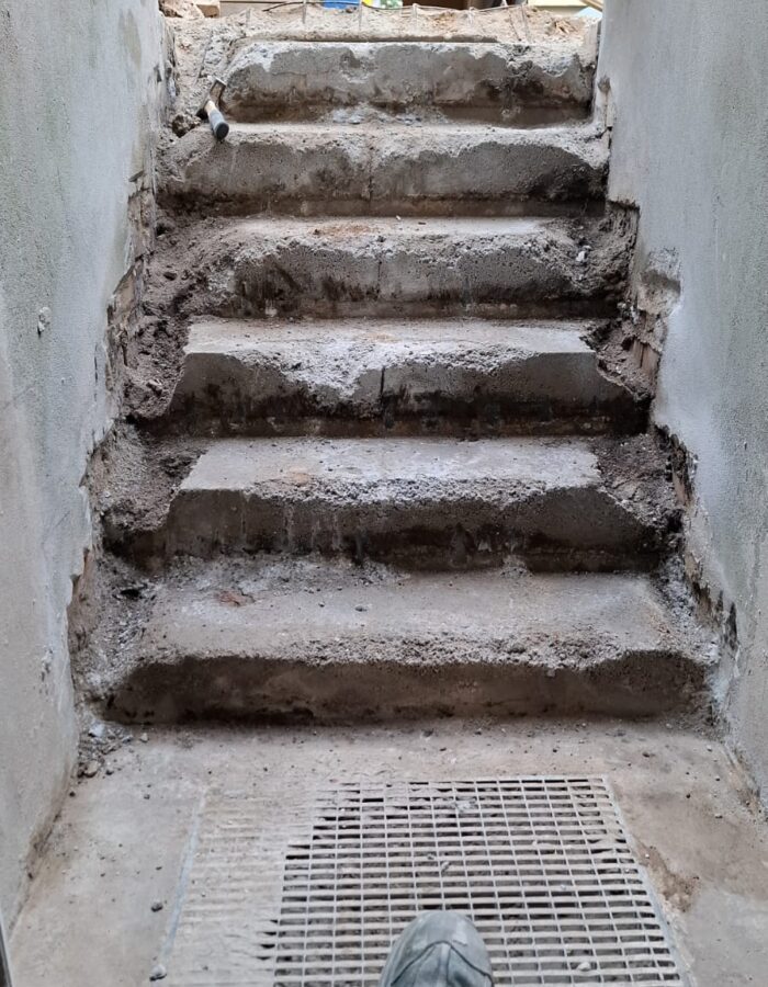 Errichtung neuer Treppen samt Podest und Stufenmauerwerk, Einbau neuer Stahlbetonhohldielen sowie Abriss maroder Holzbalken,